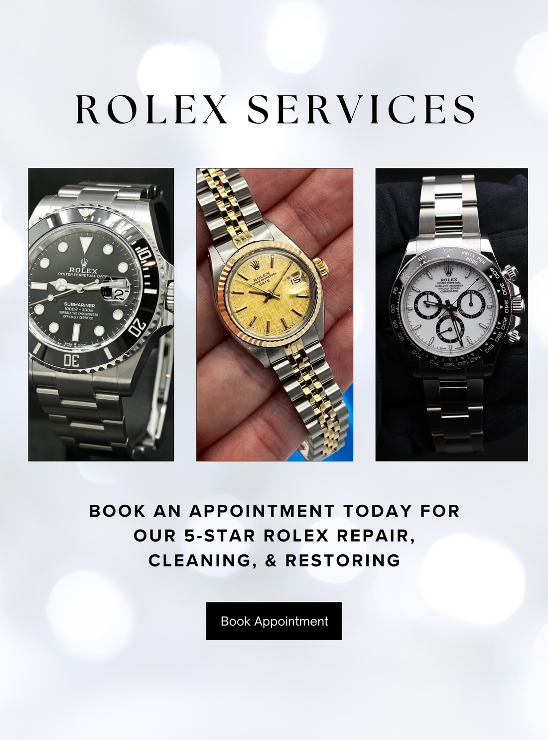 We also offer Fine Time Piece Restoration, ring sizing, custom design pieces, bead restringing, diamond replacement, and battery replacement for watches that all come with our extraordinary service. We are open to buy gold, diamonds and watches.